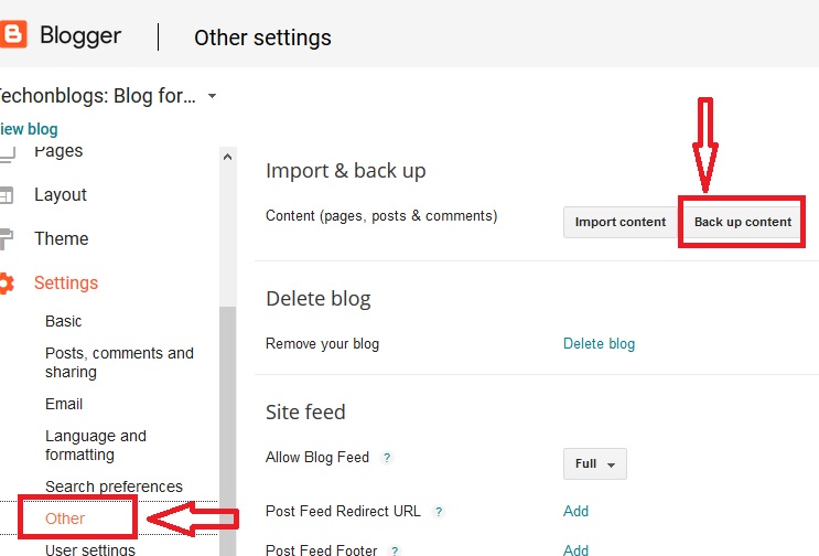 - First of all you need to export Blogger blog’s content. To do this, log into your blogger dashboard and go to setting > other & click on the “backup content” button.